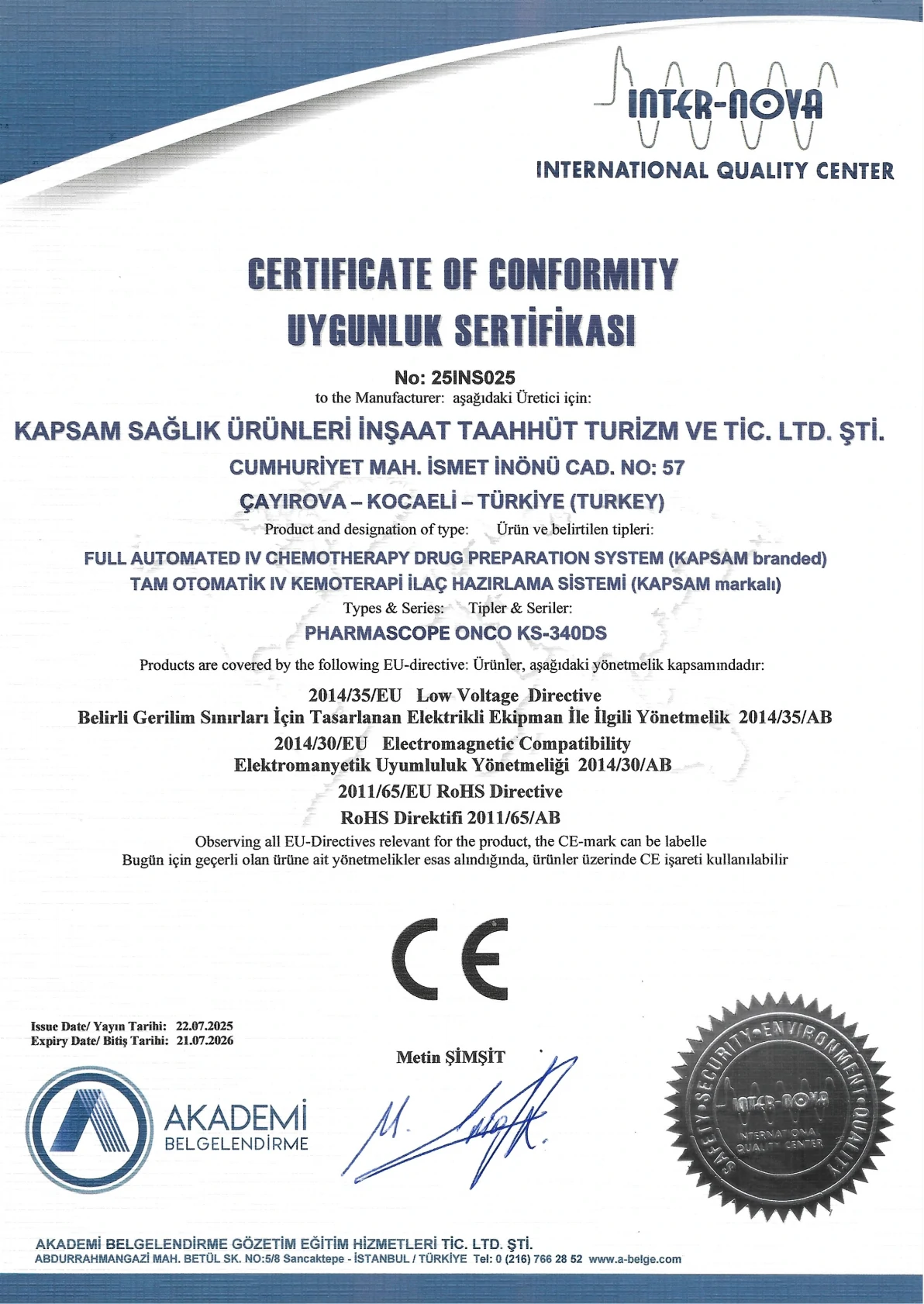 Sınıf2 Tıbbi Cihazlarımızın CE Belgesi